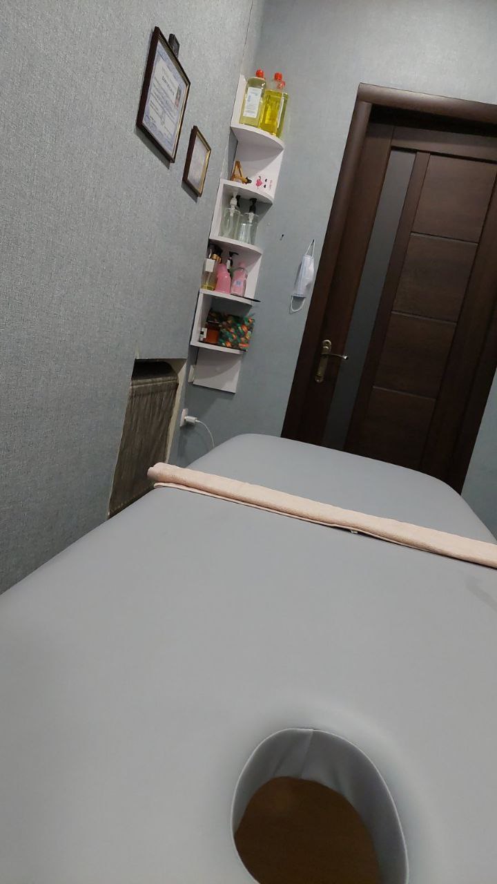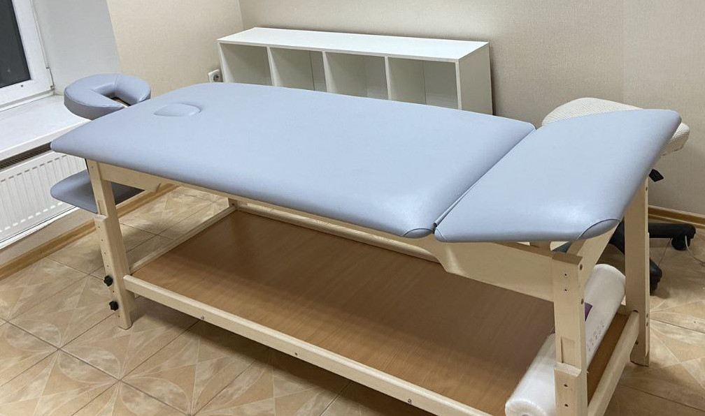 Массажная кушетка оснащёна полкой для полотенец, простыней и других принадлежностей, необходимых мастеру во время процедуры массажа.