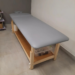 Масажна кушетка оснащена полицею для рушників, простирадлом та іншим приладдям, необхідним майстру під час процедури масажу.