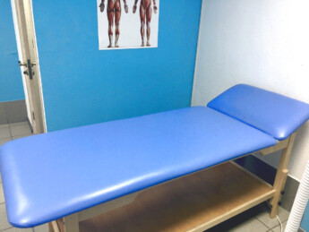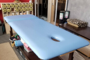 Масажний стіл оснащений полицею для рушників, простирадлом та іншого приладдя, необхідним майстру під час процедури масажу.