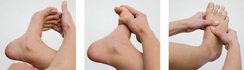 Это проводят техникой обхватывания сухожилий пальцами и покручивают саму стопу в разные стороны.